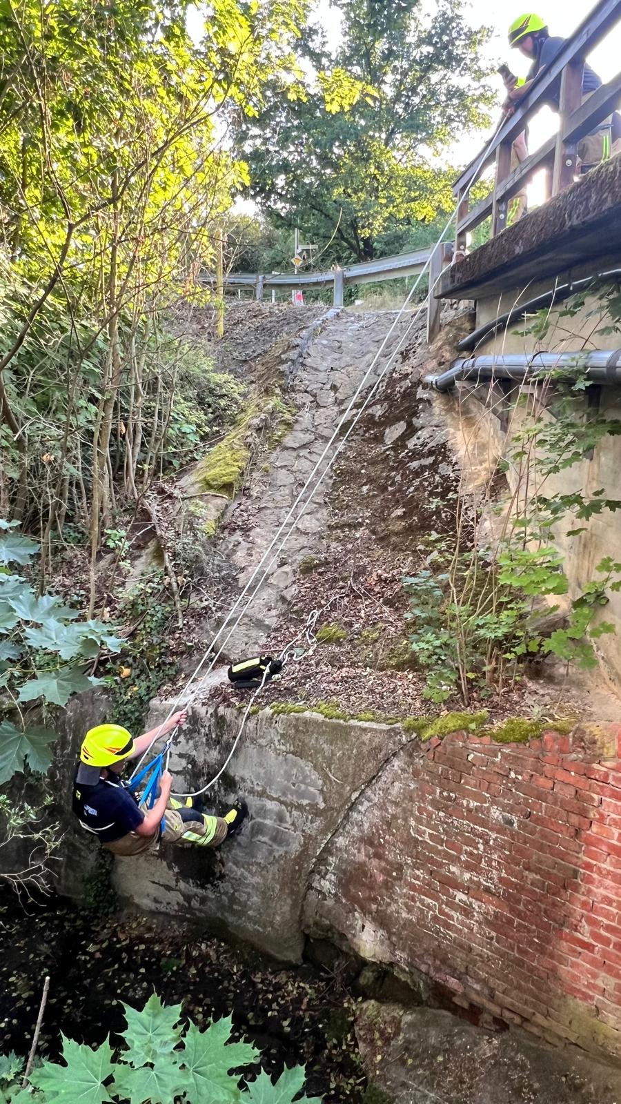 Zuerst musste eine Verkehrsabsicherung erstellt werden. Danach wurde das Abseilen mit zusätzlichen Rettungsknoten als Sicherung geübt sowie das „Absteigen“ am rutschigen Untergrund.