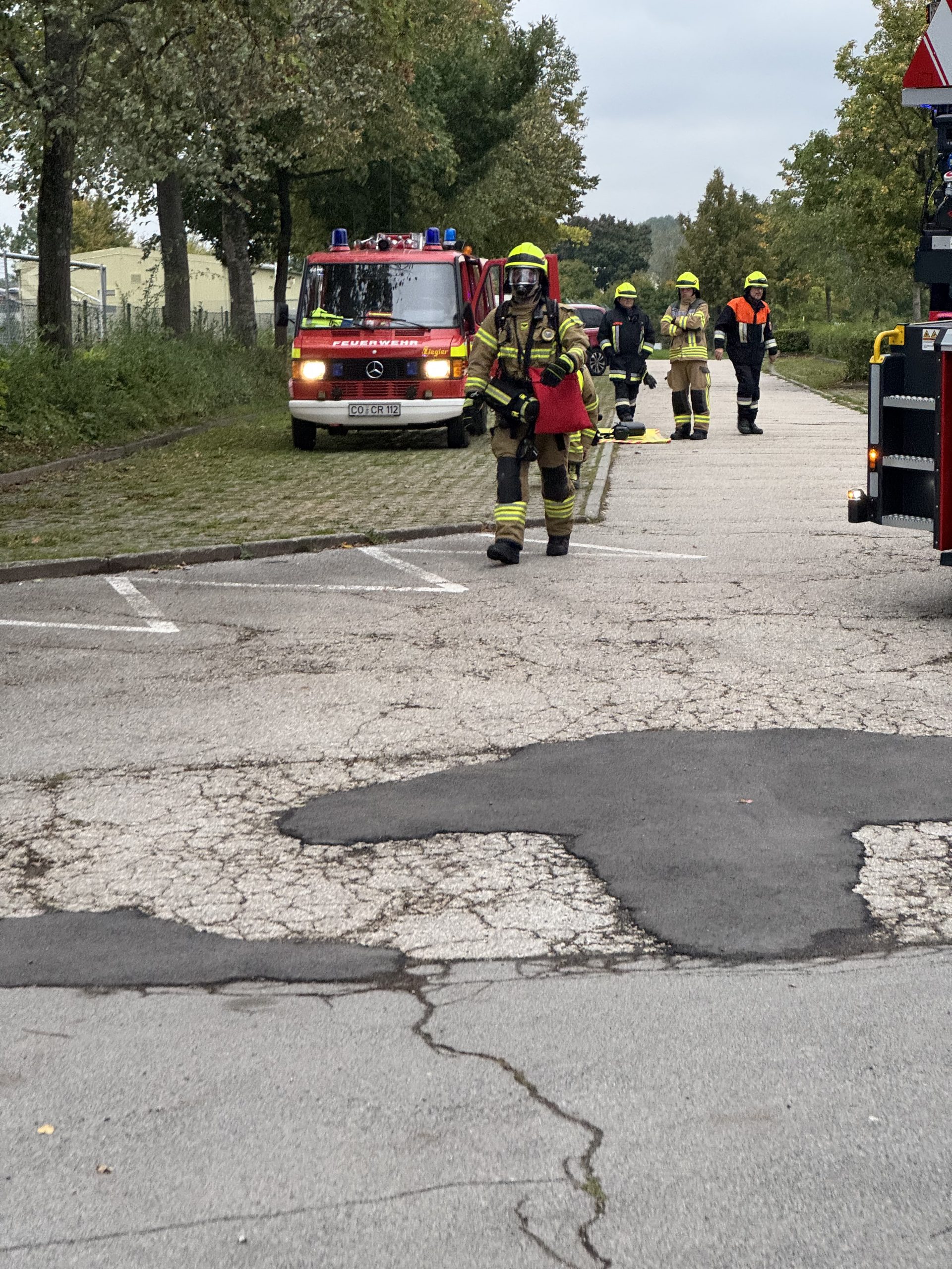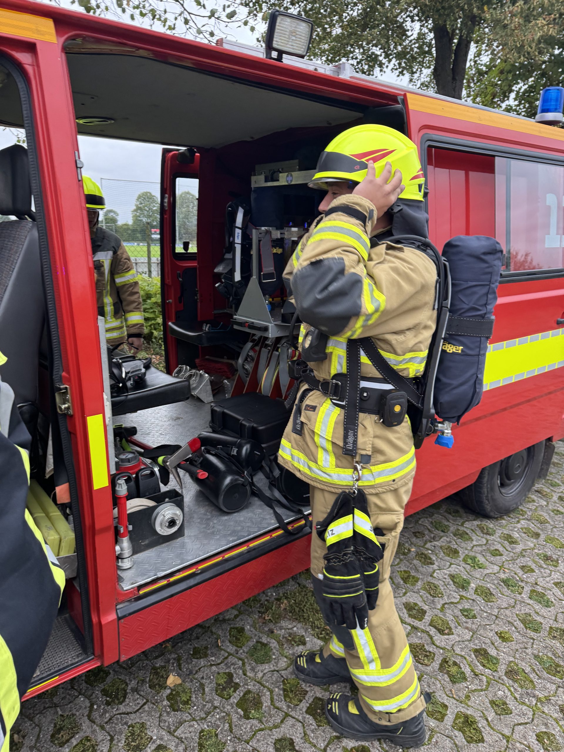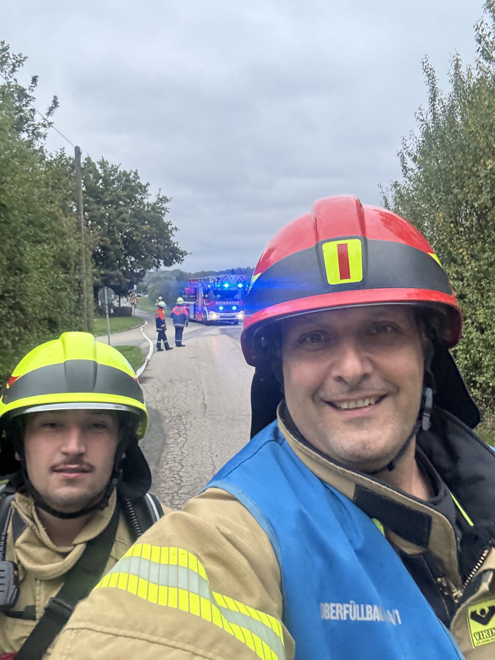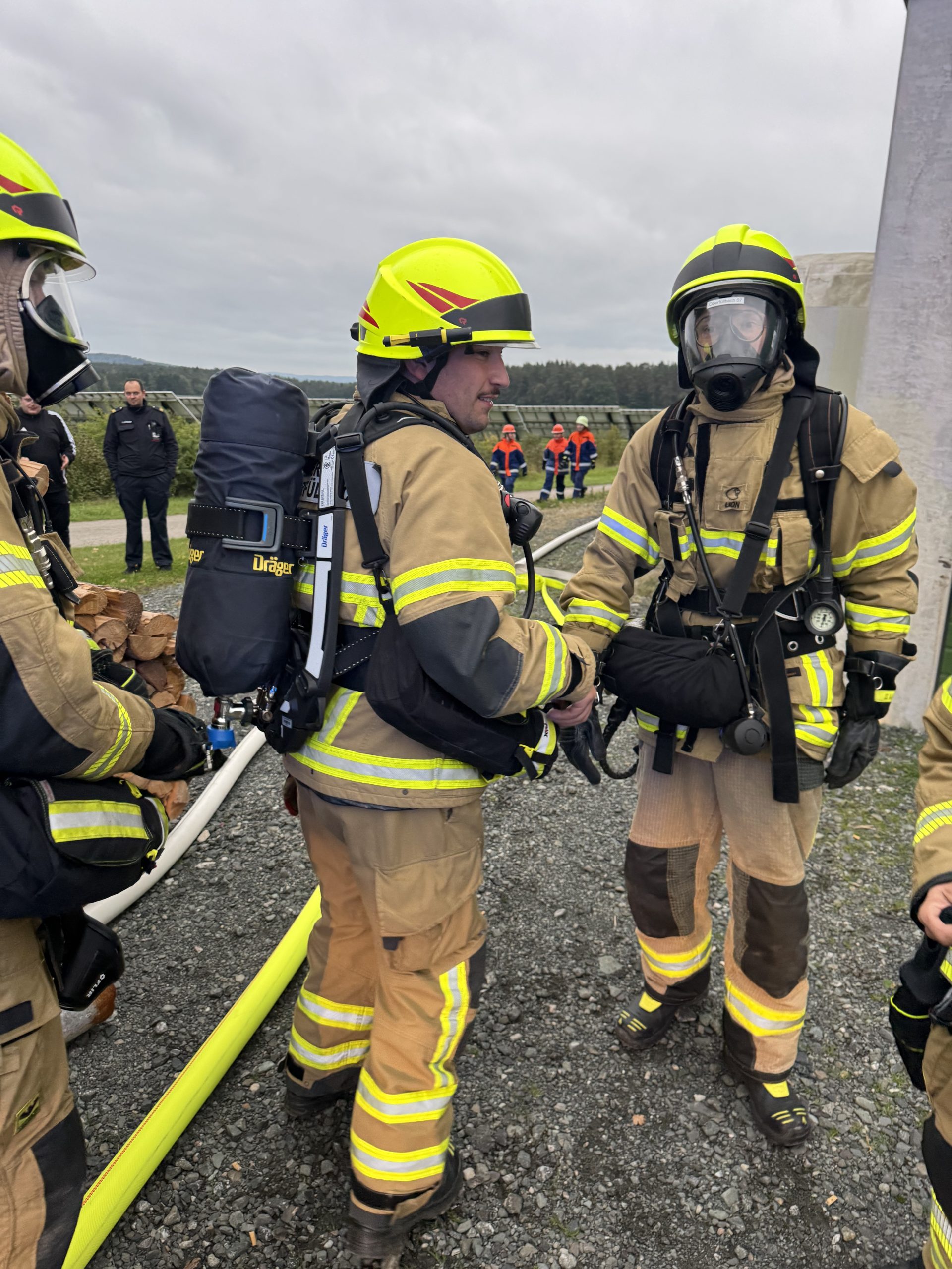 Die Ff Oberfüllbach rüstete sich mit Atemschutz aus und unterstützte mit zwei Trupps die Brandbekämpfung über das Hallendach.
