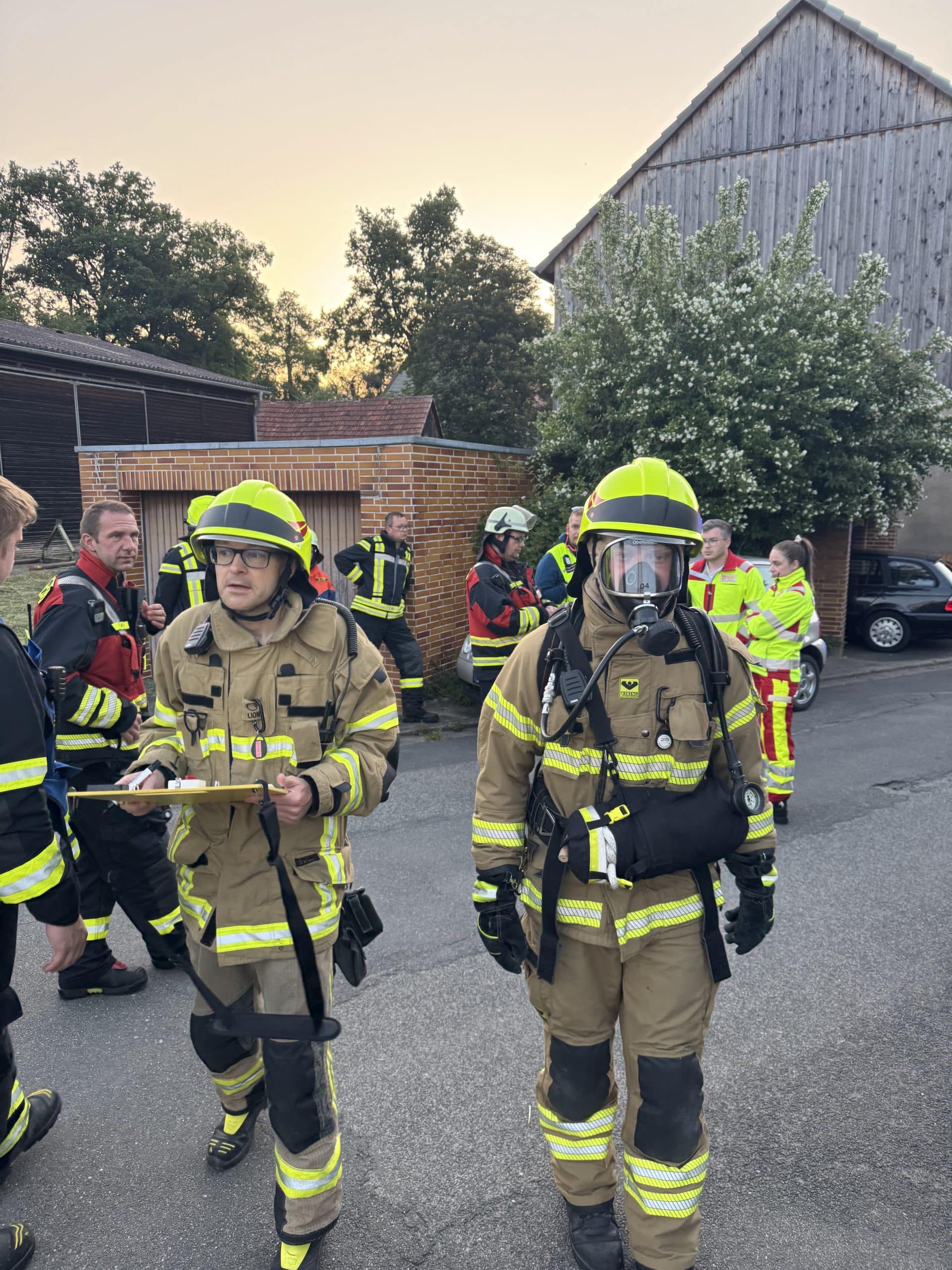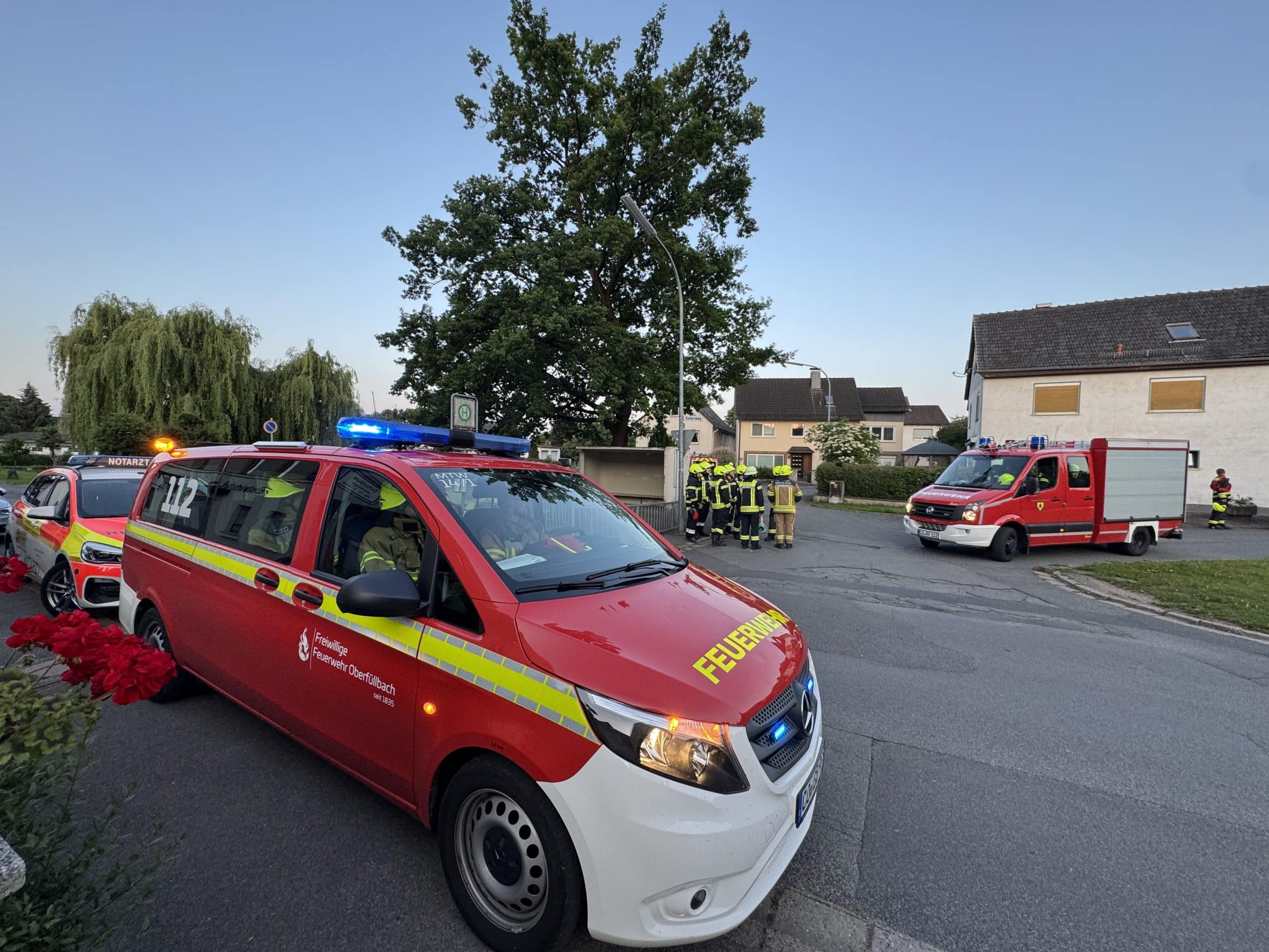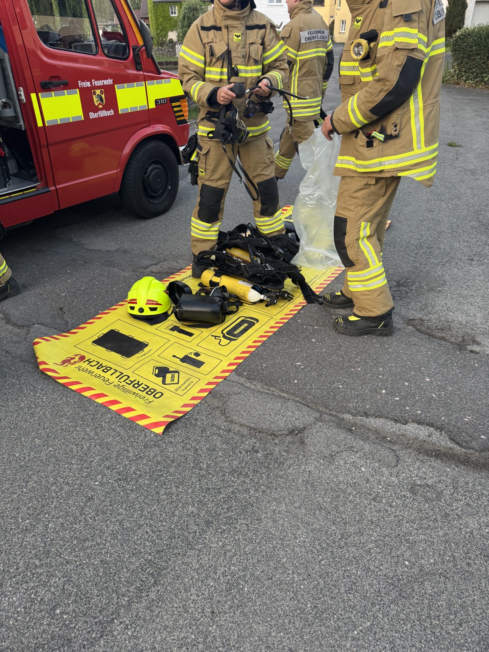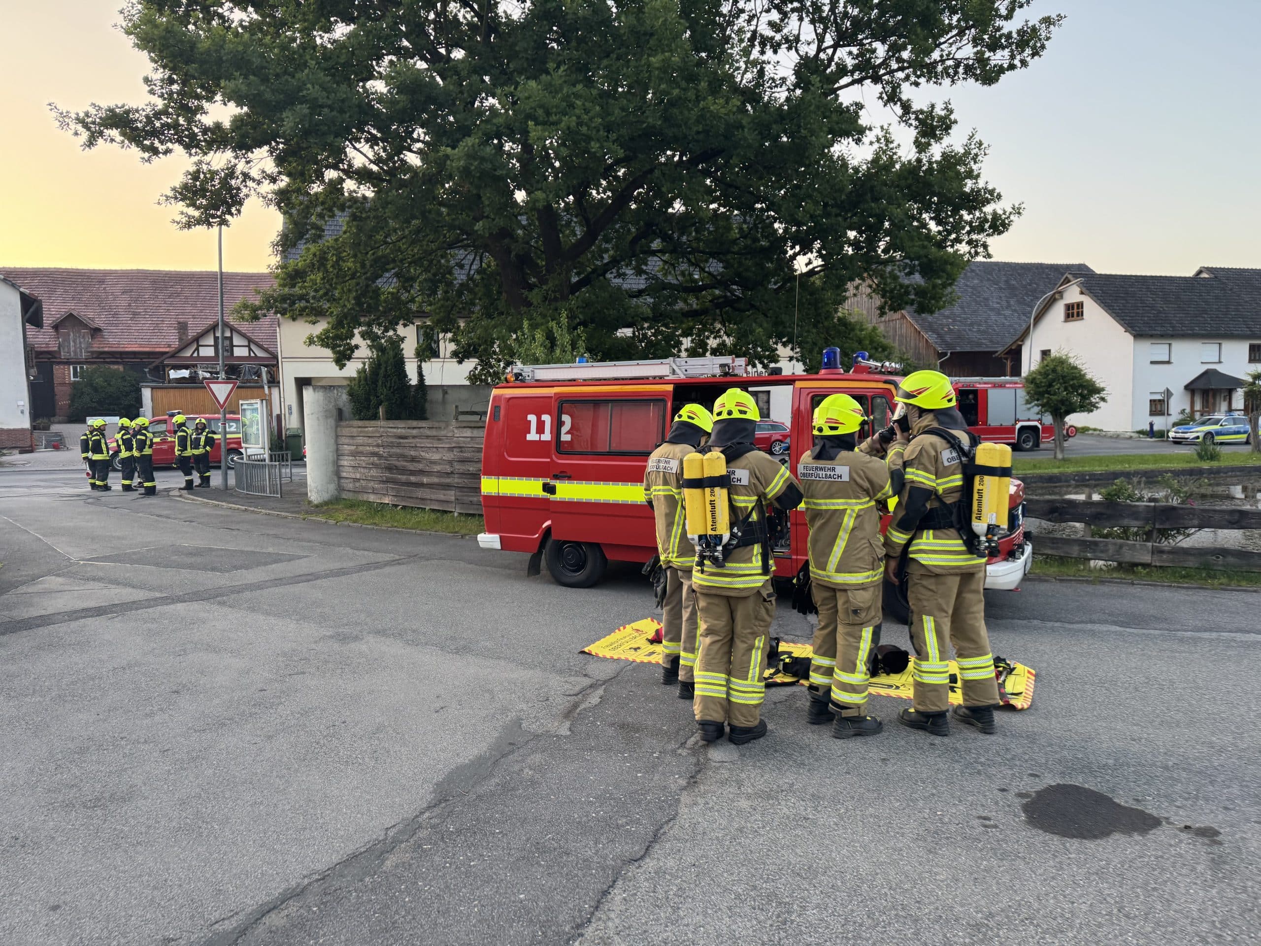 Vor Ort war der Einsatzleiter bereits mit der Erkundung fertig und gab ersteinmal Entwarnung. Zur Sicherheit wurde ein Trupp der FF Oberfüllbach unter Atemschutz und mit Warngerät durch das ganze Haus zur Erkundung geschickt, die aber zum Glück nichts anzeigte.