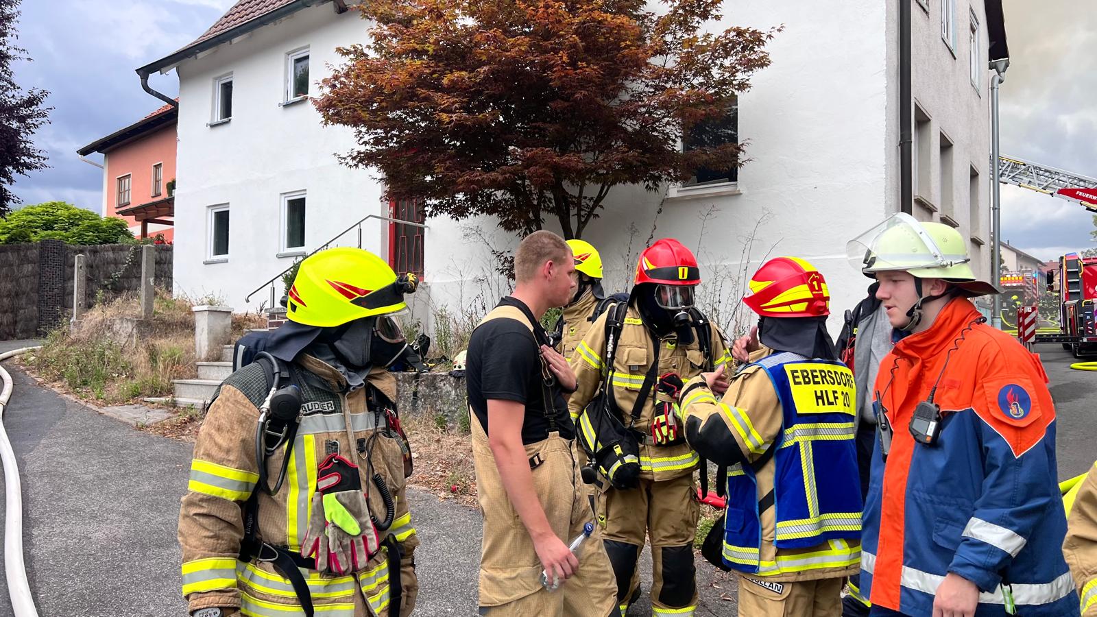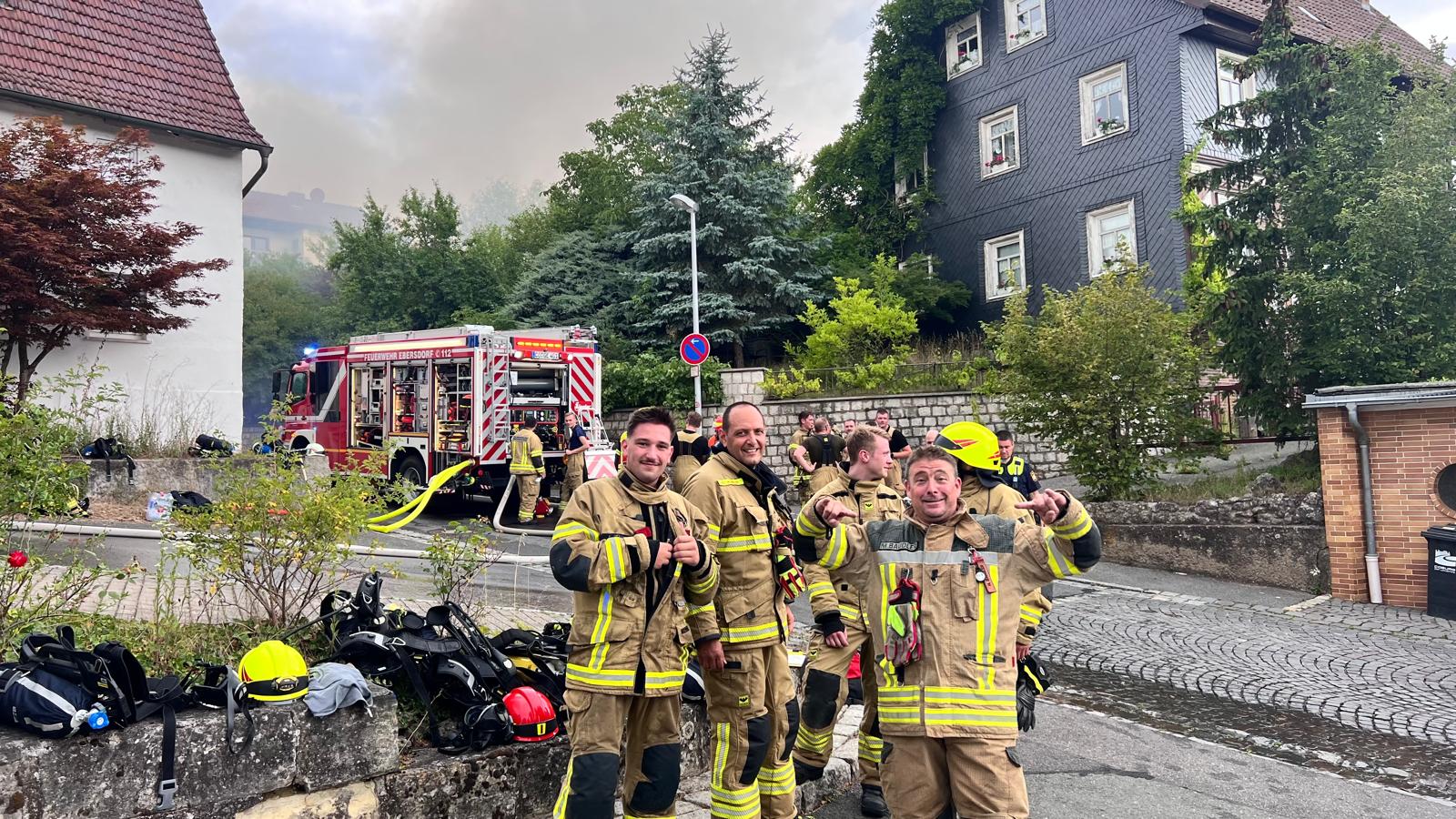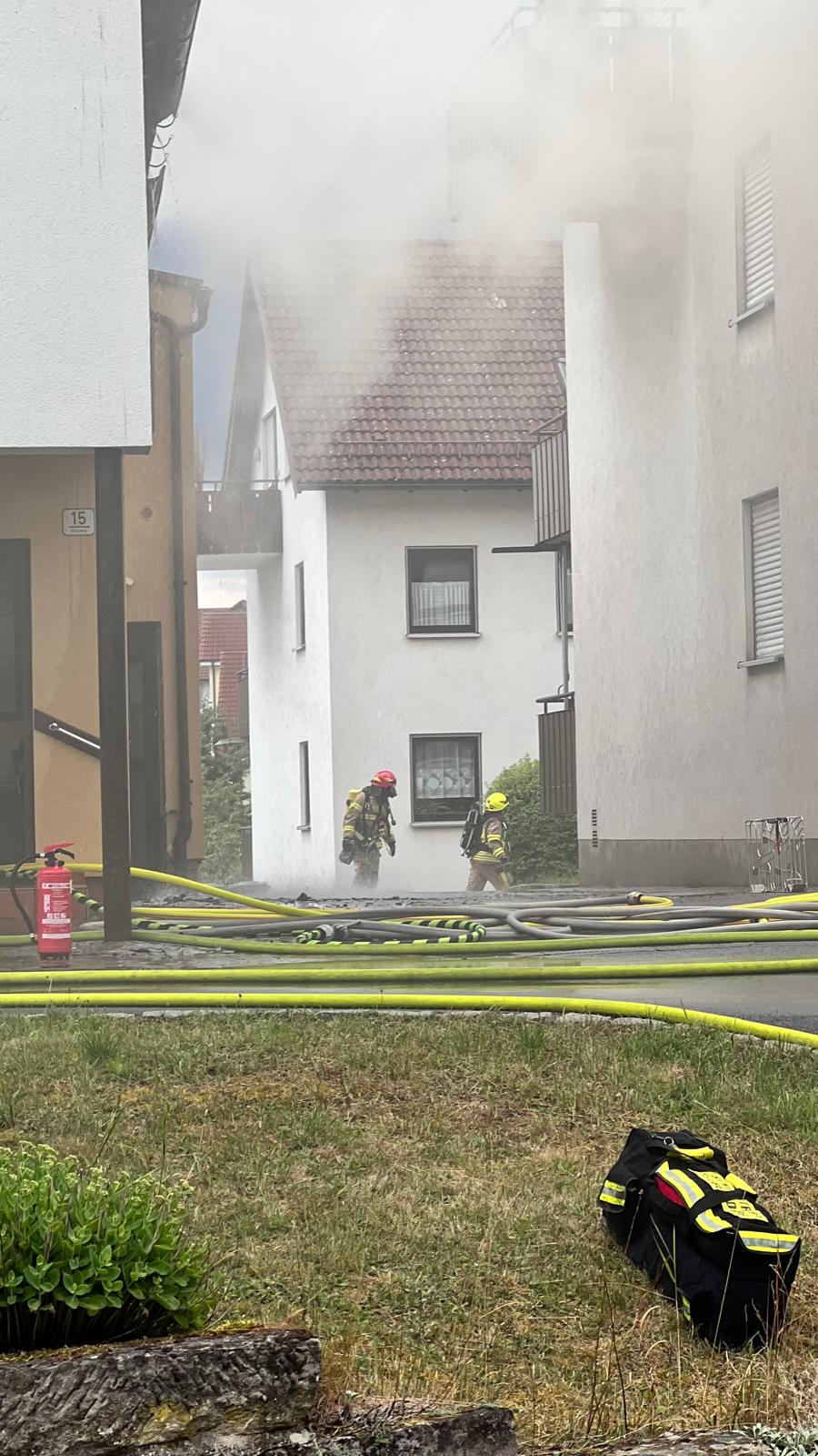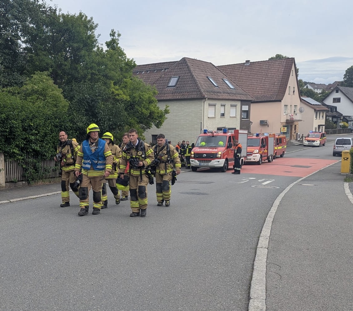 Die FF Oberfüllbach wurde zum Brand Dachgeschoss nachalarmiert. Im 44/1 standen bereits 5 AGTs bereit, die sich auch sofort ausrüsteten und zur Einsatzstelle gingen. Zwei Kameraden der FF Oberfüllbach wurden mit einem C-Strahlrohr am hinteren Haus mit der Brandbekämpfung eingesetzt. Der dreier Trupp war beauftragt, das hintere Haus im Rauch zu evakuieren. Dort befanden sich dann auch in jeder Etage jeweils ältere Frauen, die dann von dem Trupp nach außen in den sicheren Bereich gebracht werden konnten.