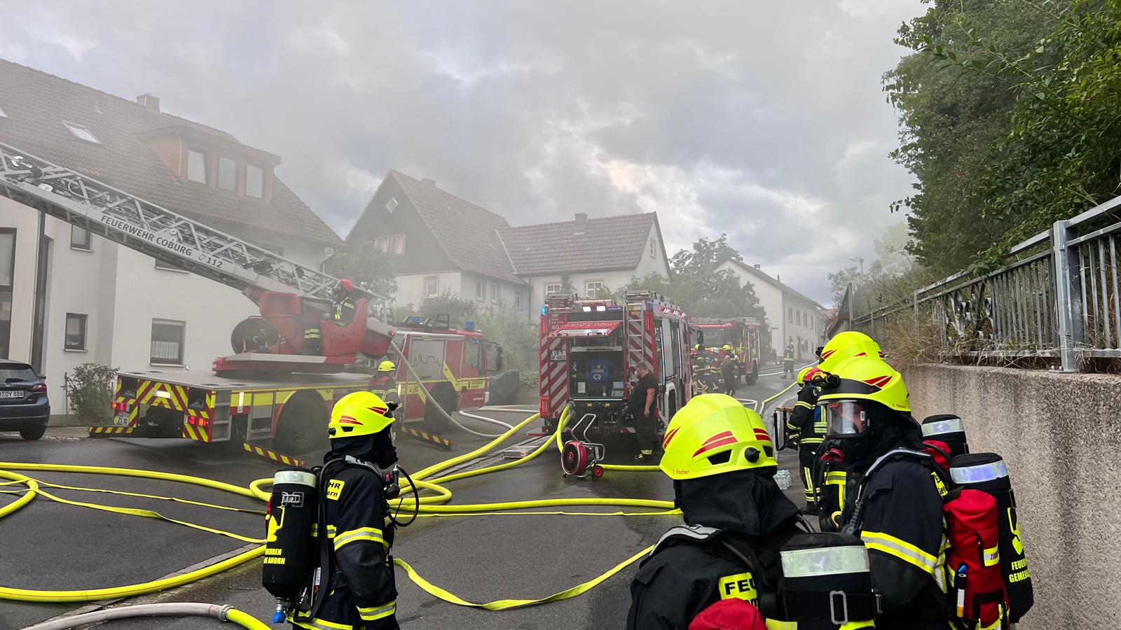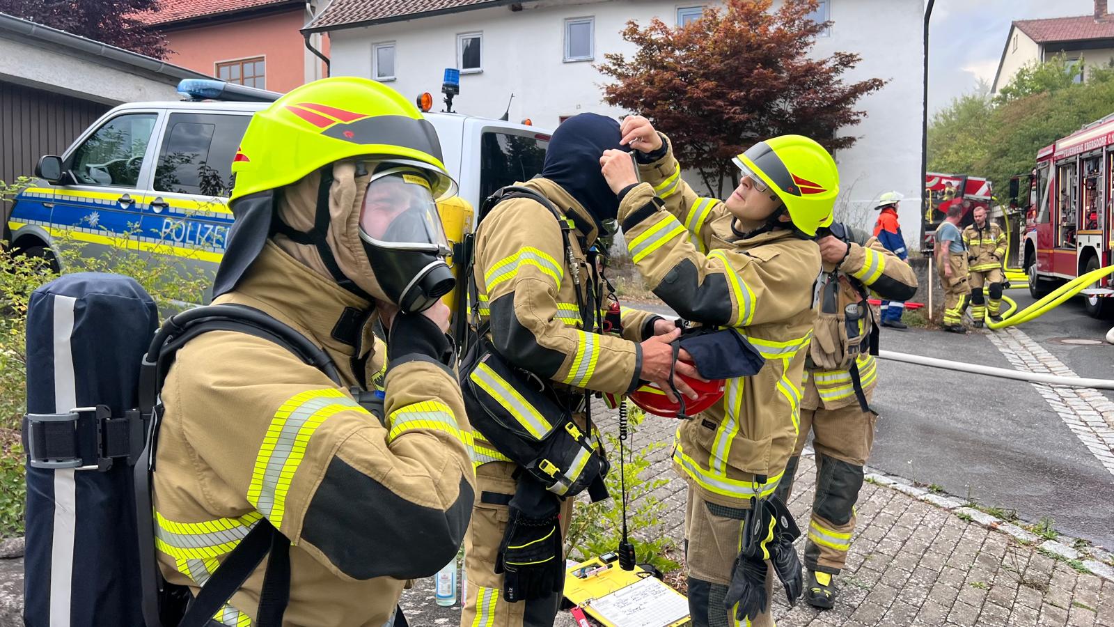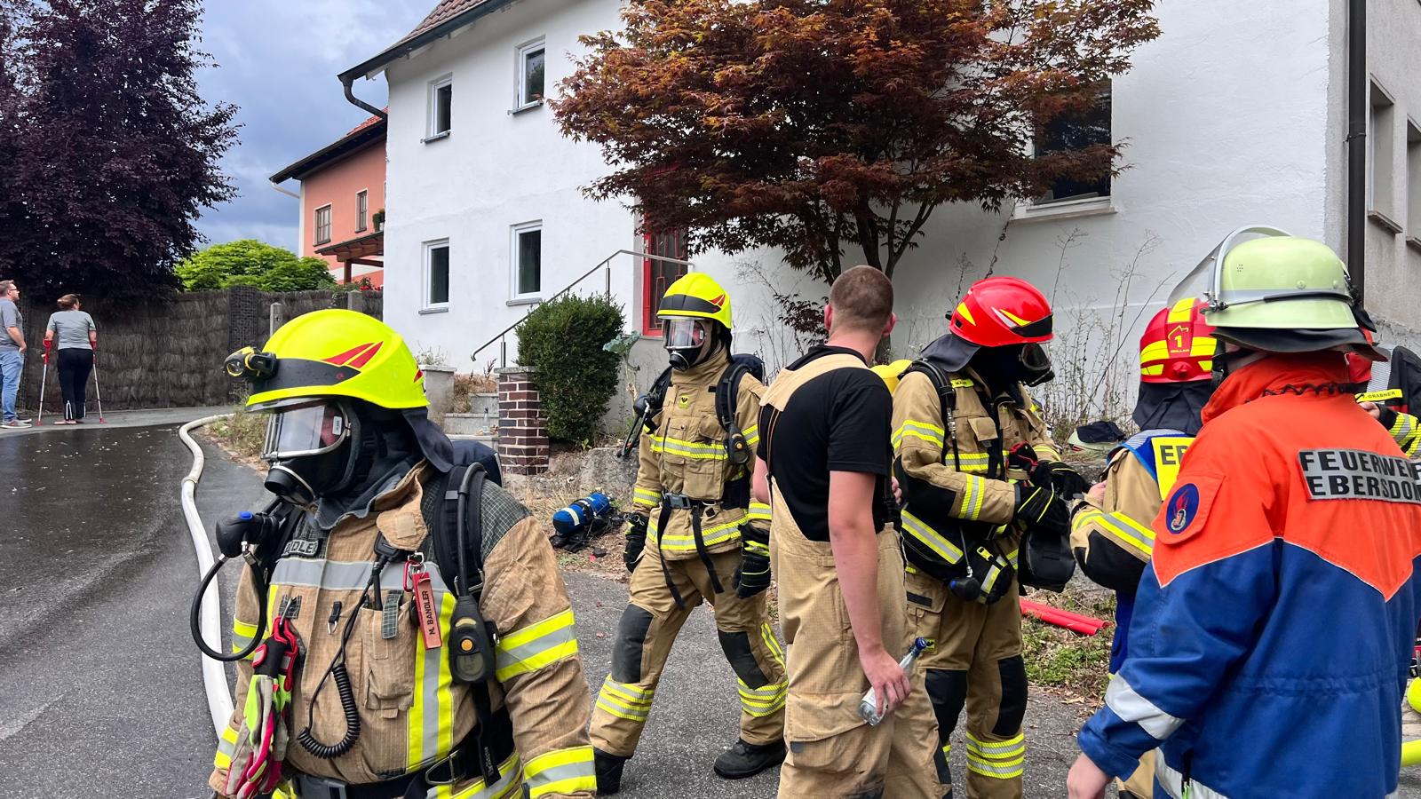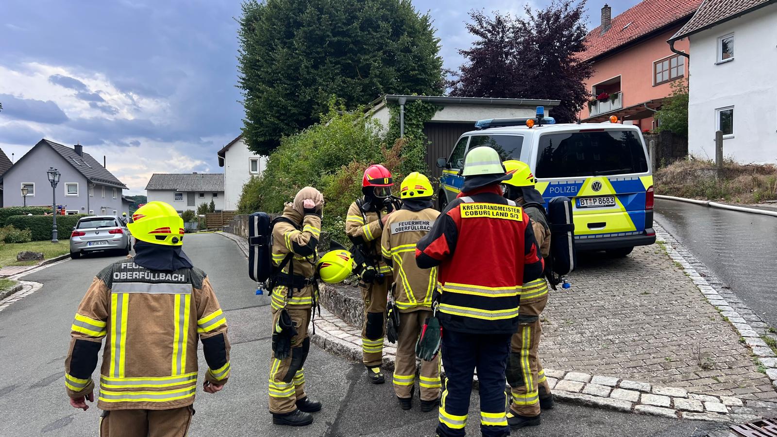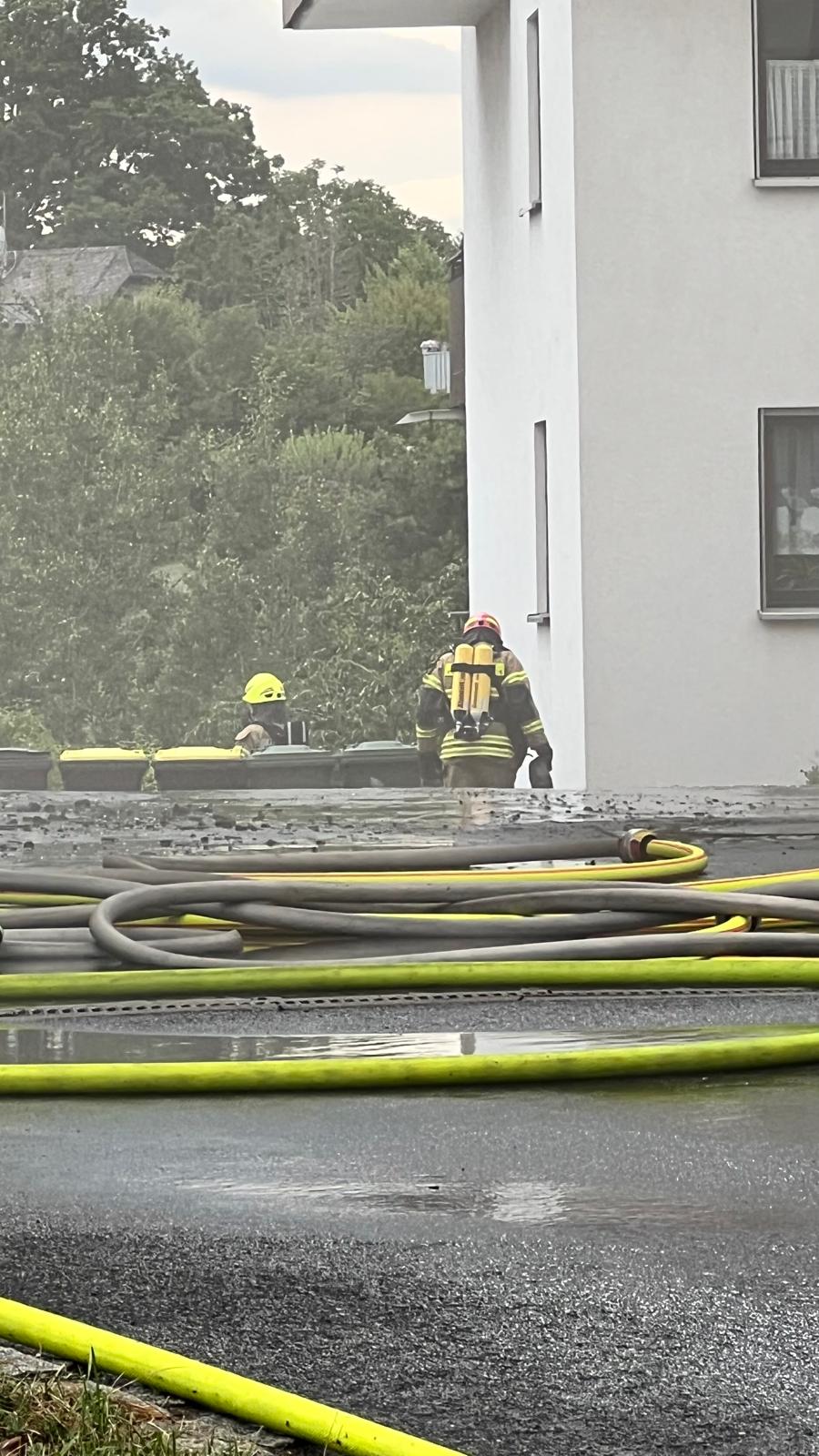 Die FF Oberfüllbach wurde zum Brand Dachgeschoss nachalarmiert. Im 44/1 standen bereits 5 AGTs bereit, die sich auch sofort ausrüsteten und zur Einsatzstelle gingen. Zwei Kameraden der FF Oberfüllbach wurden mit einem C-Strahlrohr am hinteren Haus mit der Brandbekämpfung eingesetzt. Der dreier Trupp war beauftragt, das hintere Haus im Rauch zu evakuieren. Dort befanden sich dann auch in jeder Etage jeweils ältere Frauen, die dann von dem Trupp nach außen in den sicheren Bereich gebracht werden konnten.