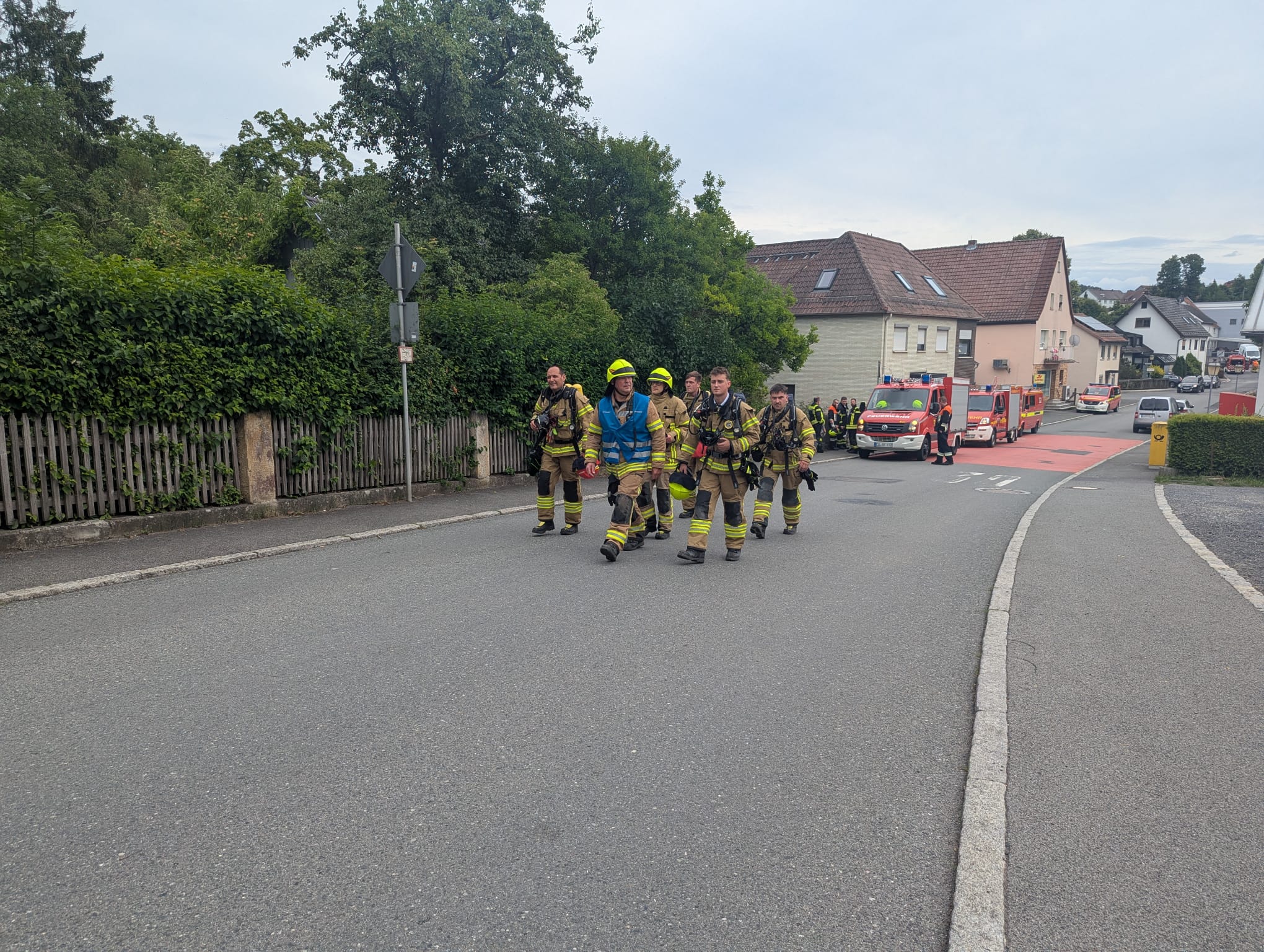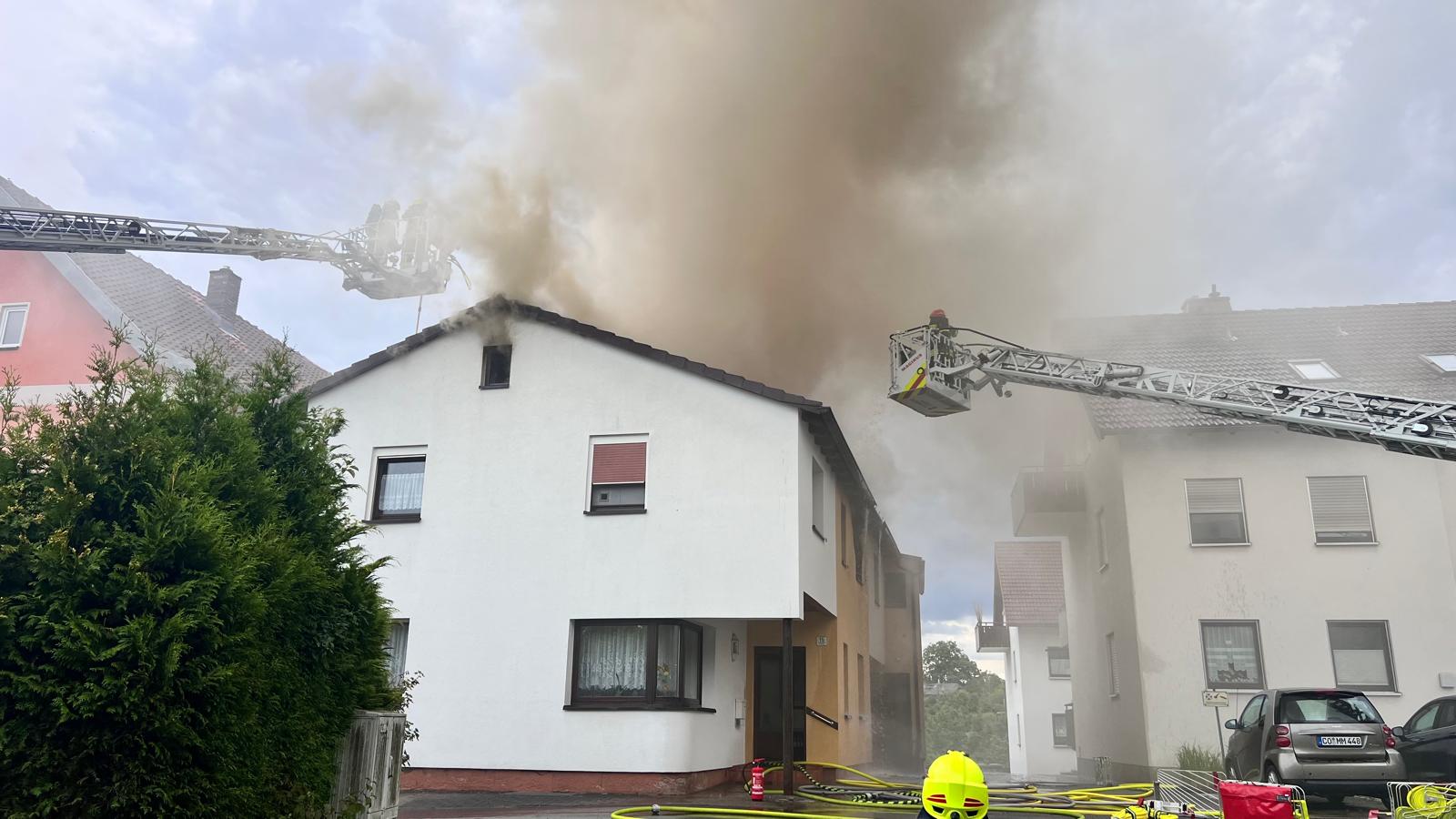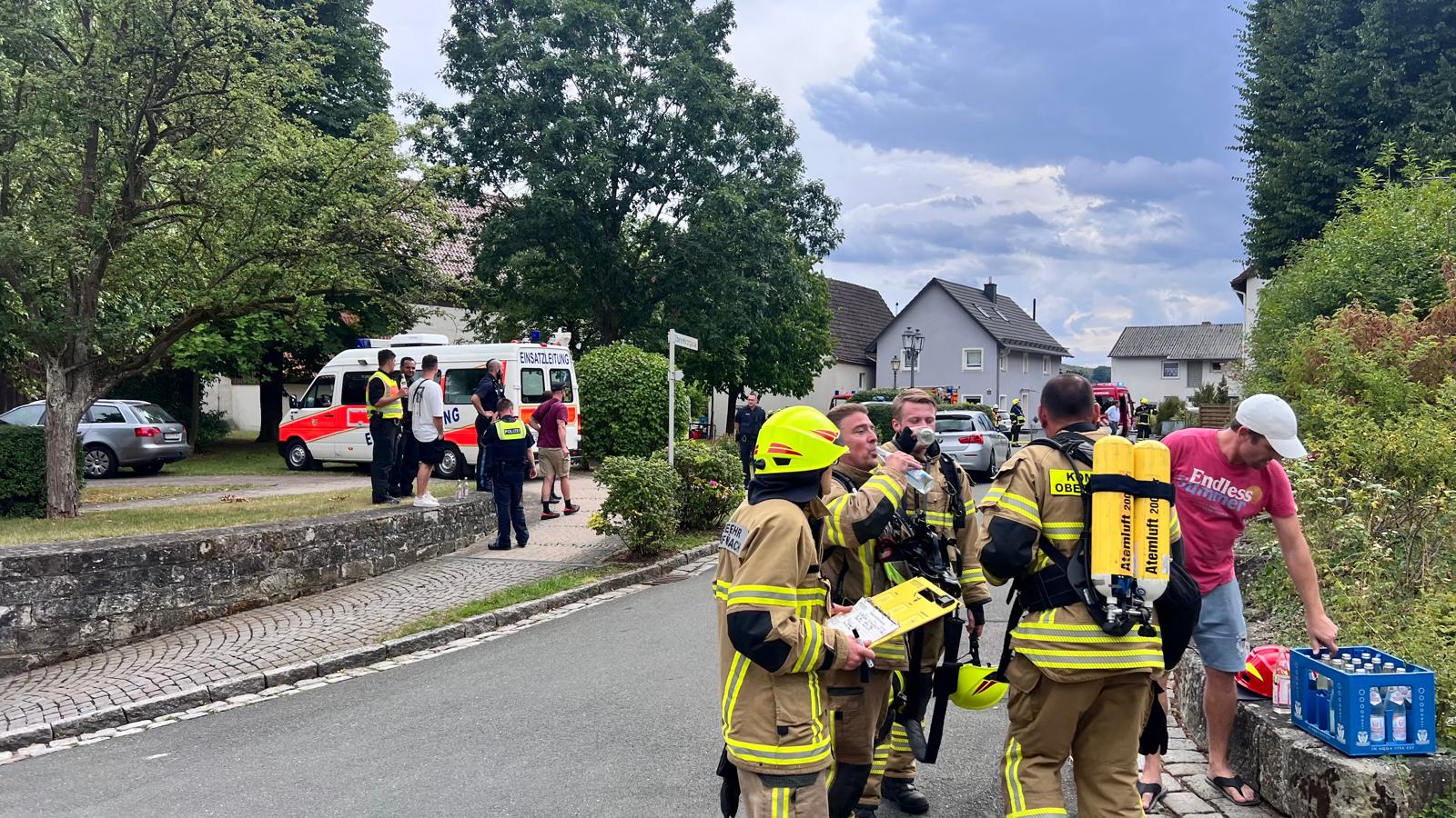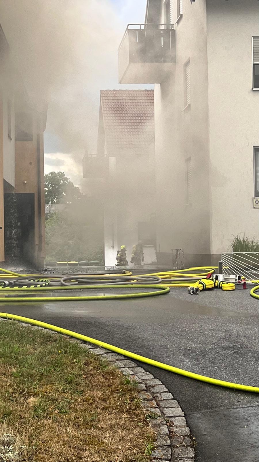 Die FF Oberfüllbach wurde zum Brand Dachgeschoss nachalarmiert. Im 44/1 standen bereits 5 AGTs bereit, die sich auch sofort ausrüsteten und zur Einsatzstelle gingen. Zwei Kameraden der FF Oberfüllbach wurden mit einem C-Strahlrohr am hinteren Haus mit der Brandbekämpfung eingesetzt. Der dreier Trupp war beauftragt, das hintere Haus im Rauch zu evakuieren. Dort befanden sich dann auch in jeder Etage jeweils ältere Frauen, die dann von dem Trupp nach außen in den sicheren Bereich gebracht werden konnten.